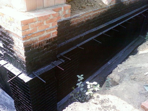 La composition bitumineuse est appliquée sur les murs de fondation avec une brosse ou un rouleau. Il est nécessaire de revêtir uniformément toute la surface. Les travaux commencent à partir du bas de la base même de la fondation et se terminent au-dessus du sol à une hauteur de 10 à 15 cm.Le bitume est appliqué en 3-4 couches de sorte que l'épaisseur totale soit d'au moins 3 cm.