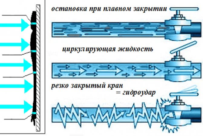 Selon les lois de la physique, même lorsque le robinet est soudainement fermé, l'eau continue de bouger. Seul le débit le plus proche de la vanne s'arrête, les couches restantes continuent de s'écouler. La collision des couches arrêtées et mobiles entraîne également une augmentation de la pression. Si l'on imagine que l'entrée a été brusquement fermée devant une foule en mouvement, alors les premiers rangs se sont déjà arrêtés - les suivants tombent dessus, continuant à marcher, cela s'avère être un coup de cœur. L'eau agit également, ce qui provoque un coup de bélier.