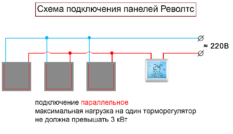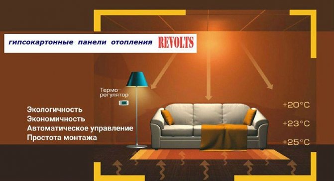 Important! Les panneaux chauffants Revolts ne nécessitent pas de conditions particulières ni d'éléments de protection contre l'incendie, car en état de fonctionnement, la température de la surface de la plaque de plâtre dépasse rarement 90 ° C.
