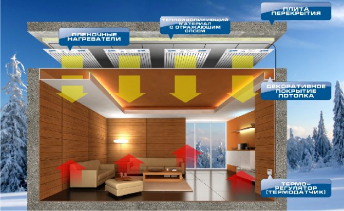 Dans ce cas, il n'y a pas de perte d'espace utilisable en raison de la suspension des radiateurs des convecteurs de chaleur, vous pouvez vous débarrasser des tuyaux et vous n'avez pas besoin de percer des canaux pour poser un câblage séparé, comme lors de l'utilisation de radiateurs électriques. Dans le même temps, il n'est pas nécessaire de disposer tout le plafond ou les murs avec des panneaux Revolts, un carré de la surface utile de la pièce nécessitera 0,7 carré de la surface chauffante, ou vice versa, 1 m2 de cloison sèche peut chauffer 1,3 m2 de la pièce.