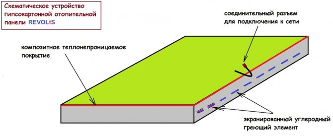 En réalité, si vous démontez le panneau Revolts, vous pouvez voir qu'il y a un film polymère transparent à l'intérieur entre deux couches de gypse, c'est pourquoi la température de surface ne dépasse jamais 80-90°C. Les fabricants de plaques de plâtre Revolts attribuent ce fait aux avantages du chauffage, car le matériau ne protège pas les murs et ne crée pas de fond, comme c'est le cas avec les radiateurs électriques en spirale.