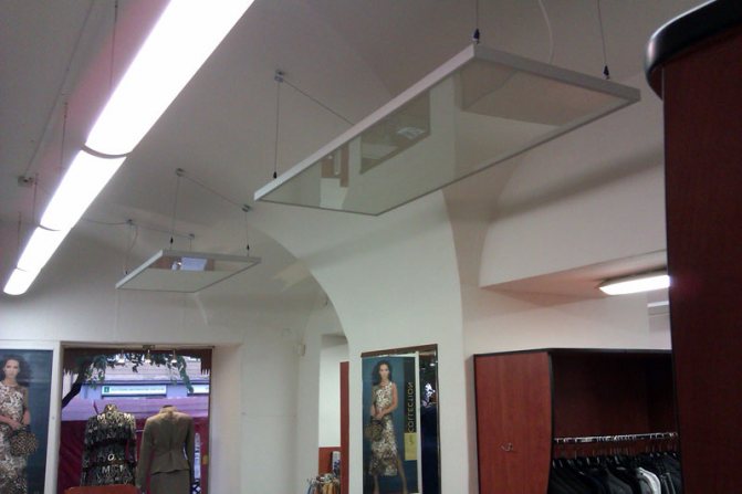 Un exemple de réalisation de panneaux thermiques montés au plafond - Le corps des panneaux articulés est en verre, en métal ou en plastique résistant à la chaleur. L'élément chauffant d'un tel dispositif est recouvert d'un écran réfléchissant en aluminium anodisé ou en céramique. En fonction de l'épaisseur de l'anodisation, la durée de vie des appareils de chauffage atteint 25 ans.