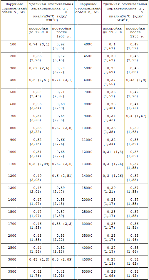 - q est le pouvoir calorifique spécifique de la maison en kcal / (m3 * C * heure). Il est recherché dans les ouvrages de référence pour chaque type de bâtiment.
