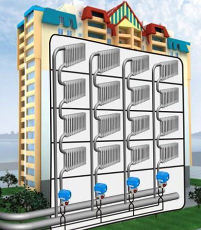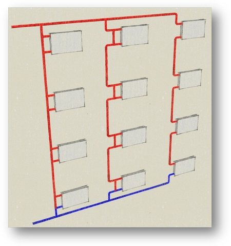 En règle générale, dans les bâtiments à plusieurs étages, un schéma de câblage monotube avec un remplissage supérieur ou inférieur est utilisé. L'emplacement du tuyau droit et du tuyau de retour peut varier en fonction de nombreux facteurs, y compris même de la région où se trouve le bâtiment. Par exemple, un système de chauffage dans un immeuble de cinq étages sera structurellement différent du chauffage dans un immeuble de trois étages.