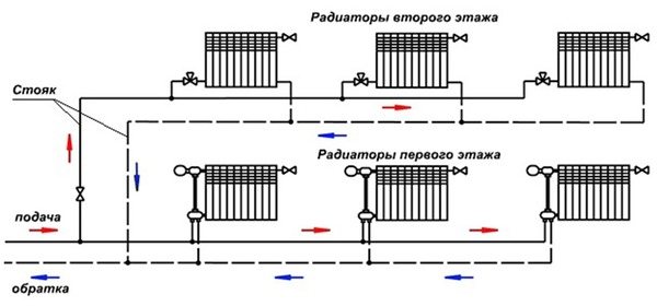 Le plus courant est schéma monotube tuyauterie. Dans la plupart des cas, il est utilisé pour chauffer des bâtiments à plusieurs étages. Un tel système se caractérise par:
