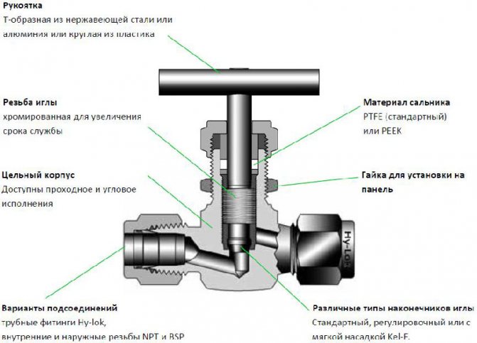 Noter! Les vannes à pointeau sont toujours en métal, parfois elles ont une poignée en plastique. Les vannes sont capables de résister à des conditions de température de -20 à + 200 ° C. Selon le type de vanne, la pression maximale à laquelle elles peuvent fonctionner atteint 15 à 45 MPa.