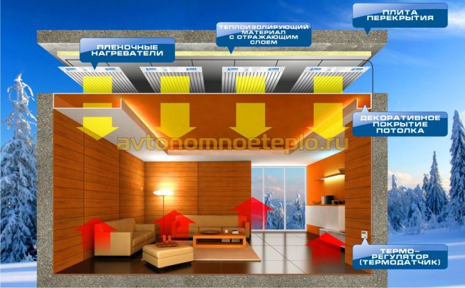 Grâce aux dispositifs à film infrarouge au plafond, non seulement l'air de la pièce sera chauffé, mais également le mobilier existant. Ainsi, la chaleur s'accumule constamment dans le salon, qui sera ensuite dégagée de la surface des objets.