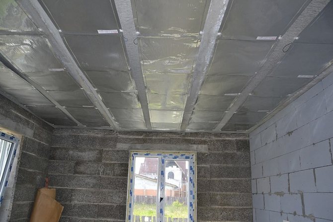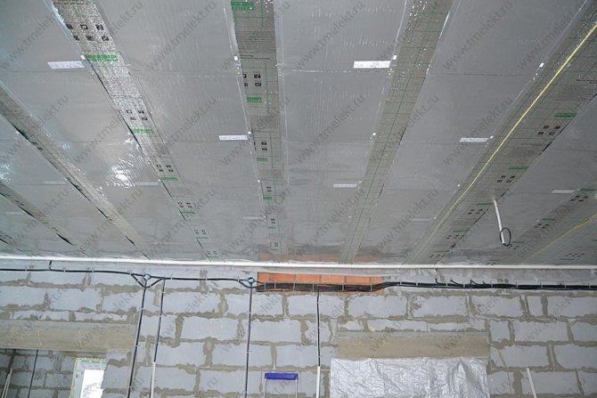 Pour l'isolation, vous pouvez utiliser du polystyrène expansé, qui est recouvert d'une couche de papier d'aluminium sur un ou les deux côtés. Le matériau doit être fixé aux plafonds à l'aide de chevilles réfractaires à ces fins. Il est recommandé de coller les joints avec du ruban adhésif. Ce n'est qu'alors que vous pourrez commencer l'installation du radiateur de plafond à film.