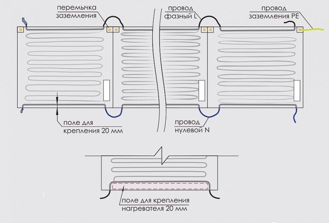 Structurellement film chauffant TM - ce sont de minces bandes de carbone reliées par des jeux de barres en cuivre, stratifiées des deux côtés avec du polyester. Cela garantit l'étanchéité du matériau et sa protection contre les chocs électriques.