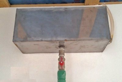 Tout artisan à la maison avec des compétences en soudage sait comment souder une boîte. Ensuite, les tuyaux sont découpés dans le vase d'expansion ouvert et scellés hermétiquement. Le couvercle est desserré pour que l'air puisse passer librement à l'intérieur. Lorsque tout est prêt, il ne reste plus qu'à vérifier la perméabilité des soudures et à installer le conteneur en place, comme indiqué sur le schéma: