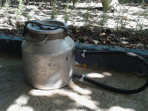 - un récipient prêt à l'emploi est utilisé, comme une grande casserole, une bouteille de lait ou une canette pour 12-15 litres ou plus;