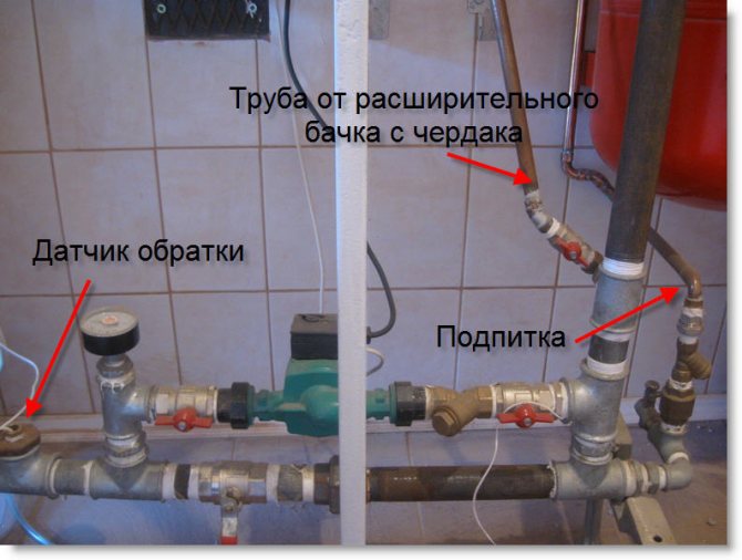 - Pour que la tuyauterie soit installée correctement, une attention particulière doit être accordée à seulement deux endroits du système: l'endroit où le liquide de refroidissement pénètre dans le vase d'expansion (doit être effectué au point supérieur) et l'endroit où il sort (transporté par le bas).