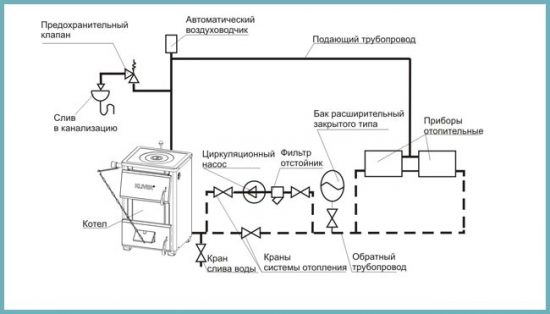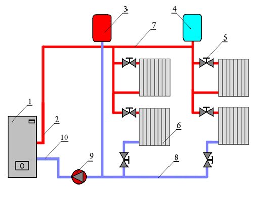 Le liquide de refroidissement circule dans le système de chauffage sous l'action d'une pompe de circulation. Le circuit de chauffage dans ce cas n'a aucun contact avec l'environnement et le réservoir n'est qu'un réservoir avec un volume de réserve, grâce auquel le liquide de refroidissement peut se dilater pendant le fonctionnement du système de chauffage.