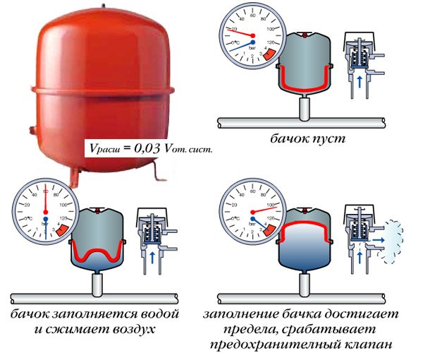 Si le volume du réservoir est insuffisant, une décharge d'urgence de liquide de la chaudière de chauffage se produira très probablement, ce qui est absolument inacceptable. À la suite d'un déverrouillage d'urgence, le niveau de pression dans le système peut diminuer tellement que l'unité ne peut tout simplement pas commencer à fonctionner en mode automatique. Et si le propriétaire n'ajoute pas le liquide manquant en temps opportun, le système peut dégivrer ou même échouer complètement.