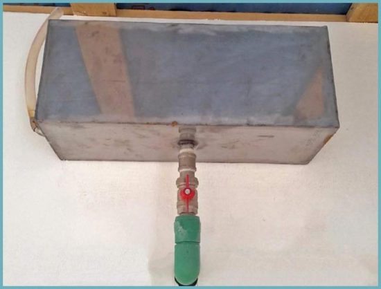 Important! Réservoir rectangulaire nécessite un renforcement supplémentaire des murs avec une quantité d'eau impressionnante (option maison). Cela alourdit l'ensemble du mécanisme d'expansion, qui doit être soulevé jusqu'au point le plus élevé du système de chauffage, par exemple jusqu'au grenier.