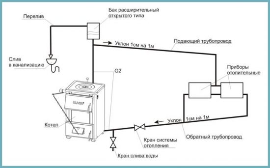 - Pour éviter l'ébullition du liquide dans le vase d'expansion, veillez à deux choses: le diamètre correctement sélectionné des tuyaux de contour et la présence de la pente des contours.