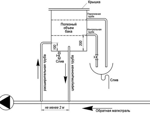 En général, le réservoir est un conteneur métallique à couvercle ouvert, fermé par un couvercle. Les buses pour connecter le système de chauffage et le tuyau de trop-plein sont découpées dans le corps du produit. Il existe également une conception plus avancée, où il y a 4 buses, les fonctions de chacune d'elles sont indiquées dans le diagramme: