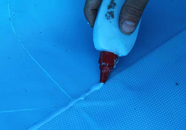 Le joint est distribué à l'aide d'un graisseur spécial. Lors de l'application de la substance sur des joints verticaux, le travail doit être effectué de haut en bas. Ensuite, il doit être laissé sécher pendant au moins 30 minutes, après quoi vous pouvez verser de l'eau dans la piscine.