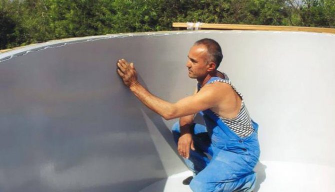 6.Après avoir installé le film sur le fond, ils commencent à placer les feuilles sur les parties verticales du réservoir, en faisant un chevauchement de 5-8 cm.Dans la zone des joints mur-bas, mur-mur dans le coin, ils résistent à un chevauchement de 15 cm. de bande. Ici aussi, avant de souder, il faut le souder.