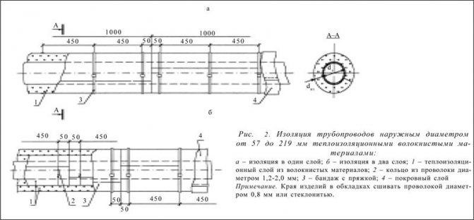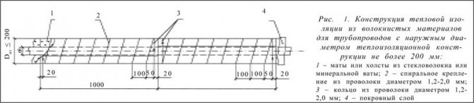 - anneaux en fil d'un diamètre de 2 mm pour les couches internes, les structures à deux et trois couches d'une épaisseur de 120 mm et plus. L'installation de trois anneaux de fil est prévue pour 1 mètre de longueur de pipeline. Les bandages en ruban de 0,7 x 20 mm sont installés sur la couche extérieure de la même manière que dans une construction monocouche.