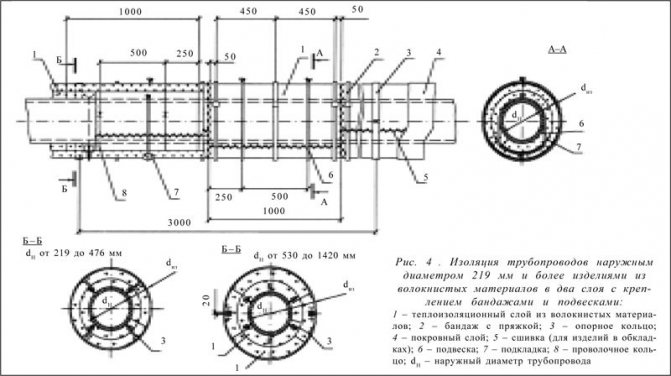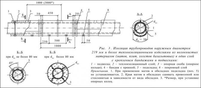 Il y a quatre chapes dans un faisceau pour l'isolation en une couche et six pour l'isolation en deux couches. Les chapes percent les couches des nattes et les fixent en croix. Des bandages en ruban de 0,7 x 20 mm avec des boucles sont installés avec un pas de 500 mm pour une isolation monocouche et le long de la couche extérieure pour une isolation à deux et trois couches. Au lieu de bandages le long des couches internes d'isolant multicouche, des anneaux en fil d'un diamètre de 2 mm sont fournis. Les pinces, les anneaux de support dans les sections horizontales et les dispositifs de décharge dans les sections verticales des pipelines sont installés comme décrit ci-dessus.