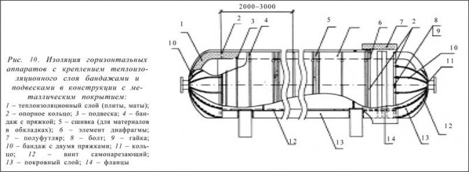 Dans le même temps, sur les appareils horizontaux, des anneaux et des bandes sont installés dans les espaces entre les broches avec un pas de 500 mm lors de l'isolation avec des tapis de couture et des plaques souples. Lors de l'isolation avec des toiles en fibre de basalte extra-fine, il est recommandé d'installer les bandages avec un pas de 250 mm. Lors de l'isolation des appareils verticaux avec l'emplacement des bandes et des anneaux dans les espaces entre les broches pour leur fixation, des chaînes de fil d'un diamètre de 2 mm sont fournies (Fig. 15).