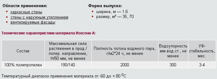 Izospan A a une surface extérieure lisse hydrofuge et une base poreuse sur la face intérieure. En raison de cette structure, l'humidité de l'isolant est rapidement absorbée par la membrane et éliminée vers l'extérieur. Lors de la pose de matériau isolant de catégorie A, deux règles doivent être respectées: