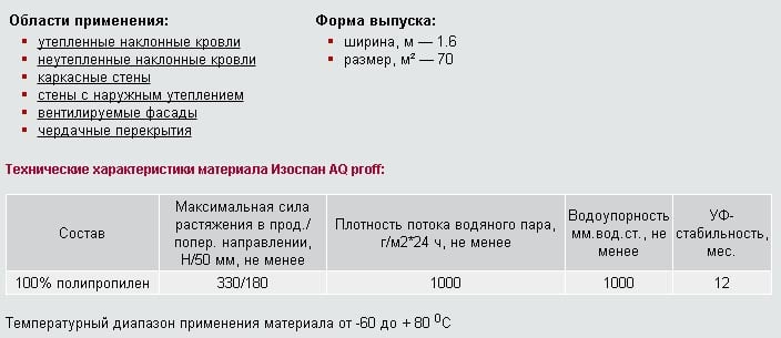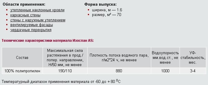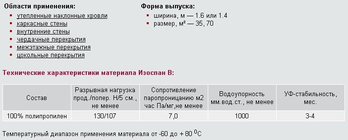 Izospan B est considéré comme universel et convient à l'isolation des murs, des toits et des plafonds intérieurs. Possède les caractéristiques techniques suivantes: