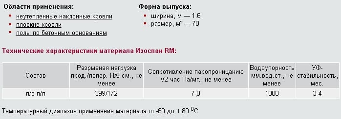 - Izospan FD est un film de polypropylène avec métallisation, le domaine d'application est la protection des structures de toit et de mur contre le vent, l'humidité à l'extérieur de la pièce et la condensation des vapeurs internes. Il peut être utilisé comme écran infrarouge. Possède une résistance à la traction accrue, résiste à des charges mécaniques importantes.
