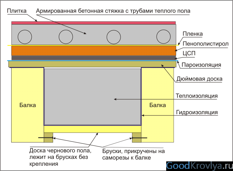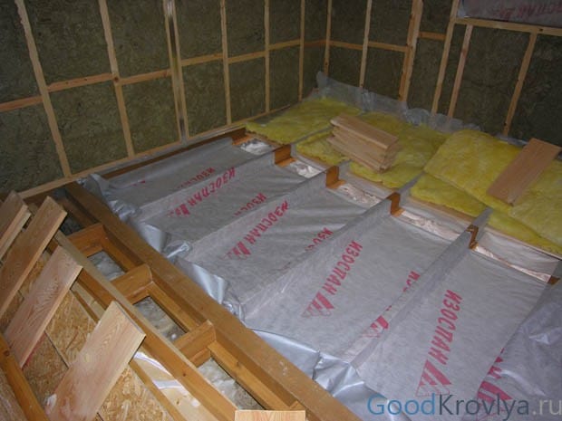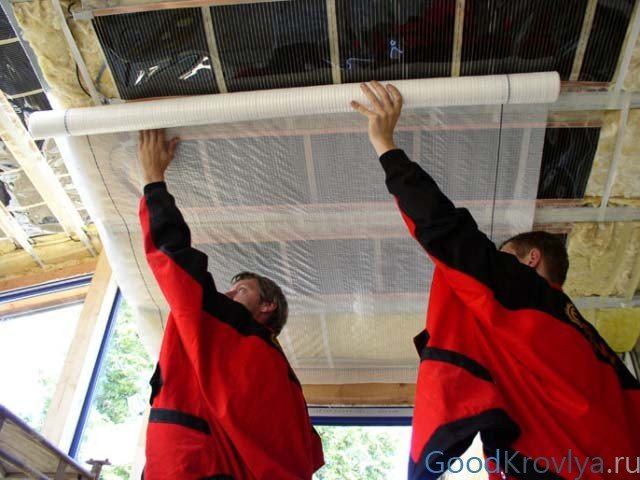 - Lors de la création de couches pare-vapeur dans les plafonds entre les planchers, le film doit être posé avec le côté lisse dans les pièces, dans une pièce;