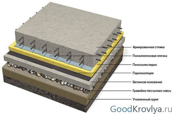 Une fondation en béton monolithique a une structure poreuse et nécessite un pare-vapeur et un pare-vapeur de haute qualité. La barrière de protection est placée au-dessus de la base en béton devant l'isolant. Le film dense minimise la pénétration de l'humidité du sol et empêche l'humidité dans le sous-sol.