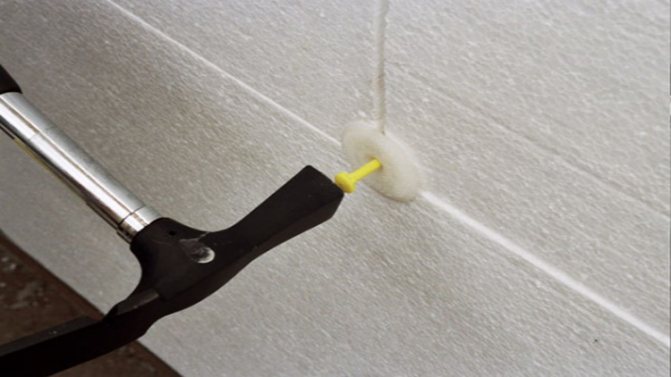 Important! Lors de la fixation de la mousse à l'aide de champignons, ils doivent être placés au niveau des joints des plaques, car, dans ce cas, le nombre de trous n'augmente pas et l'efficacité de l'isolation thermique n'est pas perdue.