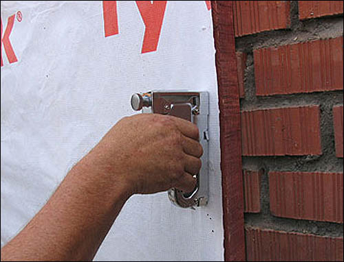 - Comment fixer une membrane coupe-vent pour une maison ? Une agrafeuse de construction est utilisée pour la tension et la fixation temporaire. Mais ce n'est qu'une mesure temporaire, les lattes doivent être fermement vissées sur le dessus, ce qui servira de caisse pour les travaux de parement ultérieurs. Mais avec l'aménagement ultérieur des façades à charnières, le travail sera plus laborieux. Tout d'abord, des supports pour panneaux articulés sont fixés au mur, après quoi des plaques de matériau isolant thermique sont montées sur des clous à goujon avec des chapeaux de champignon. Après cela, une membrane coupe-vent est tirée sur le dessus et, en l'appliquant sur le mur, des fentes sont faites pour chaque support. Et immédiatement, à travers le matériau calorifuge, ils sont fixés au mur avec des ongles-champignons similaires. Leur nombre doit être d'au moins 5 pièces / m2. S'il n'est pas difficile de clouer un contre-treillis autour du périmètre des fenêtres, alors au niveau des joints avec des tuyaux, des antennes, des conduits de ventilation, les bords sont collés sur du ruban adhésif double face ou de la colle spéciale en caoutchouc.