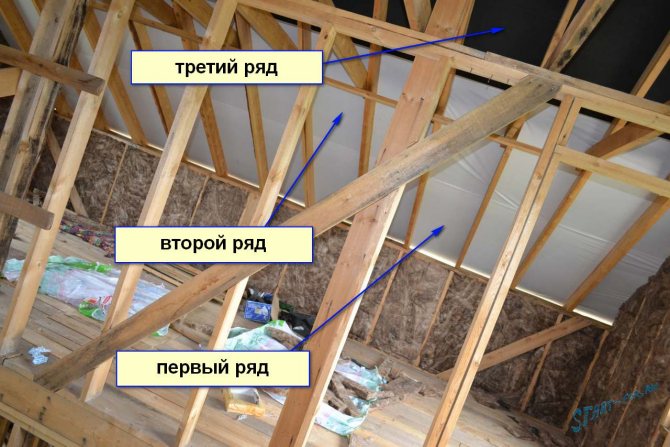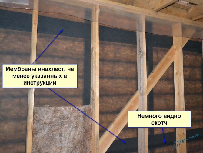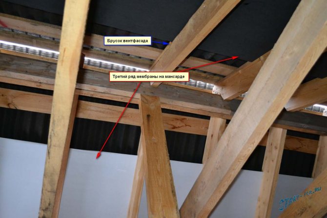 C'était intéressant de fixer la membrane aux chevrons, le rouleau est large, les chevrons sont hauts, tout comme nous n'étions pas pervertis, mais nous l'avons fait ! Deux rangées de membrane sur chaque rampe de la superdiffusion, et une rangée de pare-brise classique. Je mets l'habituel là où se trouve la partie non isolée de la pente.