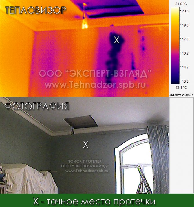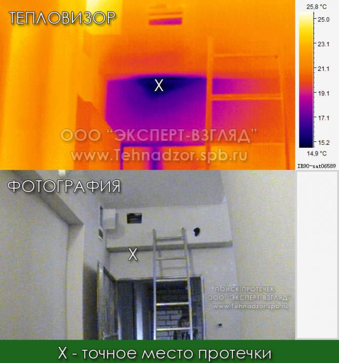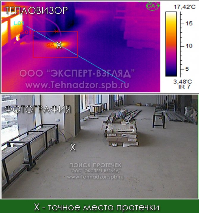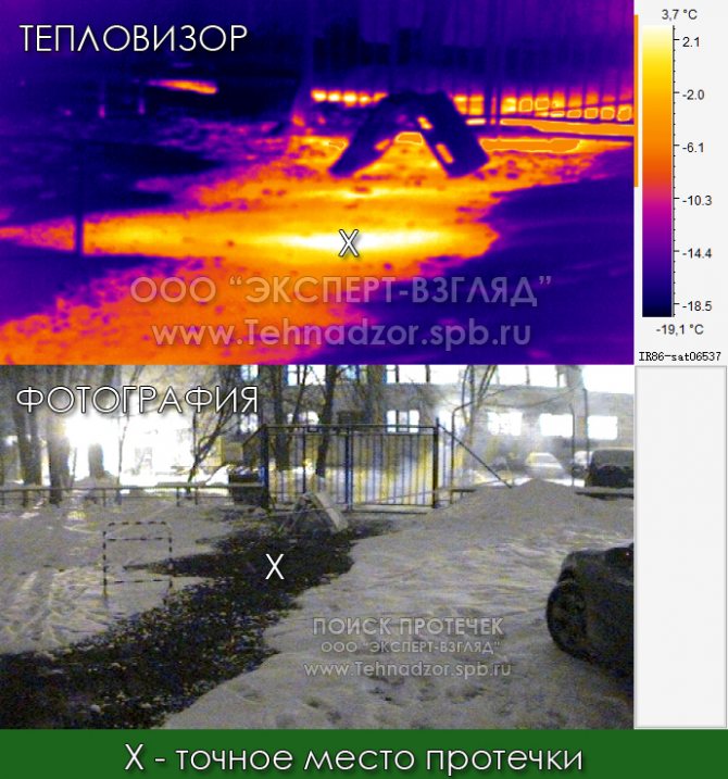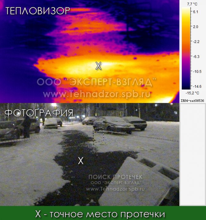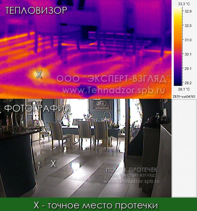 - Imageurs thermiques. À l'aide d'appareils compacts, vous pouvez immédiatement trouver des fuites d'eau dans la maison ou sous terre lorsque le pipeline est peu profond. La zone non scellée ressemblera à un point flou thermique avec une température élevée au point où le liquide de refroidissement s'écoule.