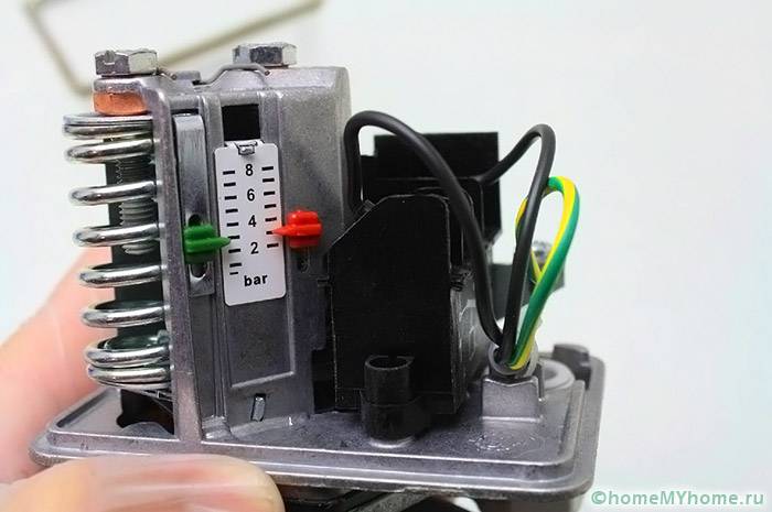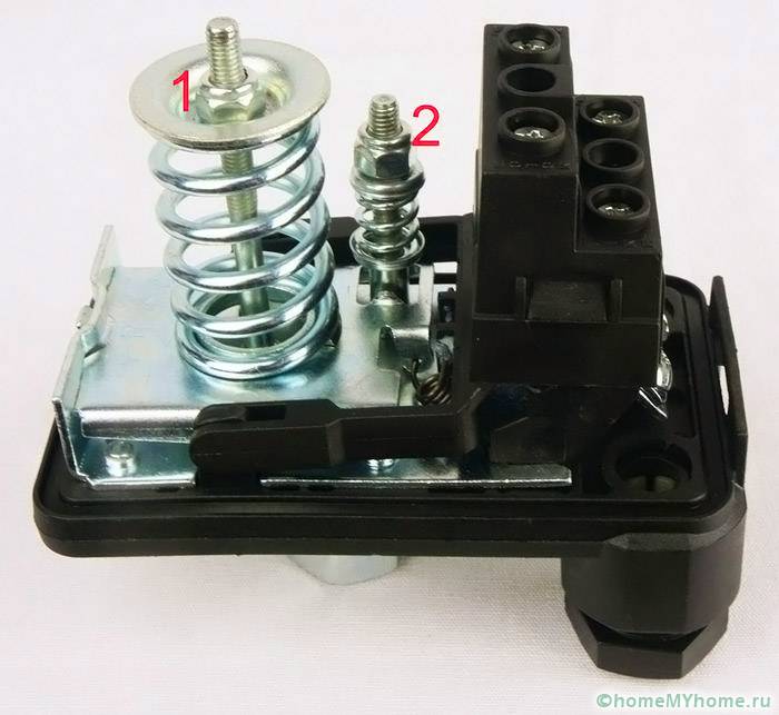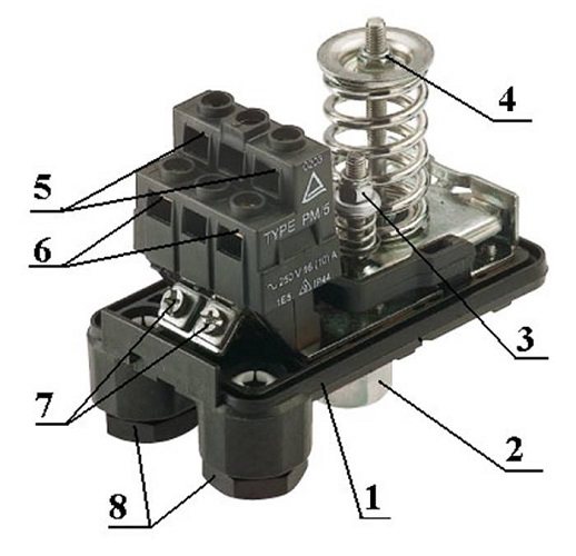 Le premier comprend un groupe de contacts qui se ferment et s'ouvrent, ce qui est nécessaire pour connecter et déconnecter la pompe. La partie hydraulique comprend un diaphragme, qui agit sur une base métallique et un ressort, petit et grand, par lequel la pression à l'intérieur de la pompe est régulée, ainsi que l'allumage ou l'arrêt.