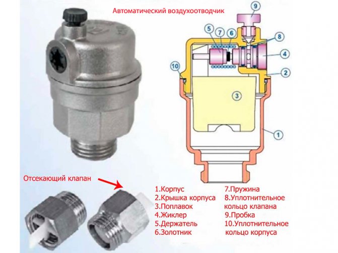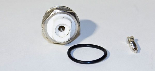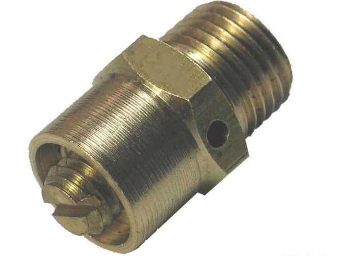 Le principe de fonctionnement est décrit dans les instructions de purge d'air. La conception de la grue de Mayevsky est plus facile à étudier à l'aide de cette figure. Un tel produit miniature est installé à la place d'un bouchon en haut du collecteur. Il y a un filetage dans la partie centrale. Une vis y est vissée, appuyant sur le joint en plastique.
