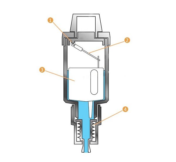 - Ils se précipitent vers le haut. Dans cette partie, la même unité est installée que dans l'évent de gaz automatique. Lorsque le flotteur descend en dessous d'un certain niveau, le courant d'air ouvrira la vanne (1) pour libérer l'air vers l'extérieur.