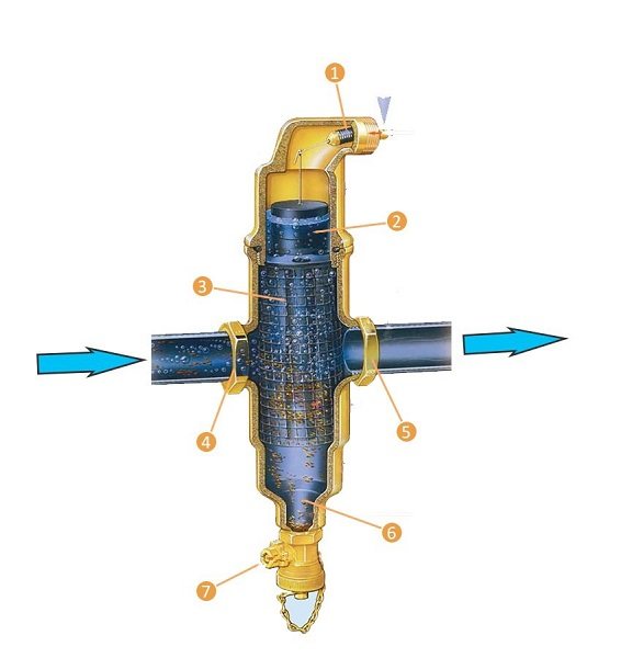 - Voici un exemple de séparateur en ligne. Il est installé au point le plus haut de la section du pipeline à l'aide de raccords filetés (4, 5).