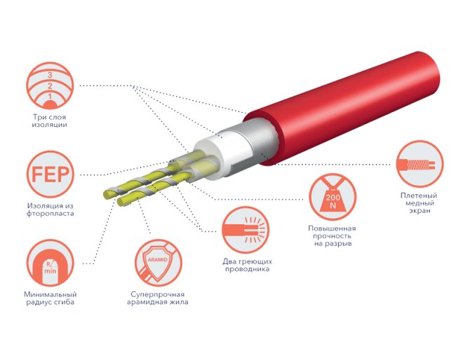 Le principe est simple - il y a un câble à l'intérieur duquel se trouve un élément chauffant qui chauffe et transfère sa chaleur au carreau dans notre exemple. Autrement dit, c'est le principe de tout radiateur électrique. Les radiateurs à huile ordinaire fonctionnent également (ils chauffent l'huile à l'intérieur du radiateur, qui transfère déjà la chaleur à l'environnement), les «souffleurs à vent» ordinaires ont également un élément chauffant qui, soufflé par le vent, du ventilateur fournit de la chaleur à la pièce. Ainsi, le câble chauffant par le sol est également une sorte d'élément chauffant, uniquement de très faible puissance.