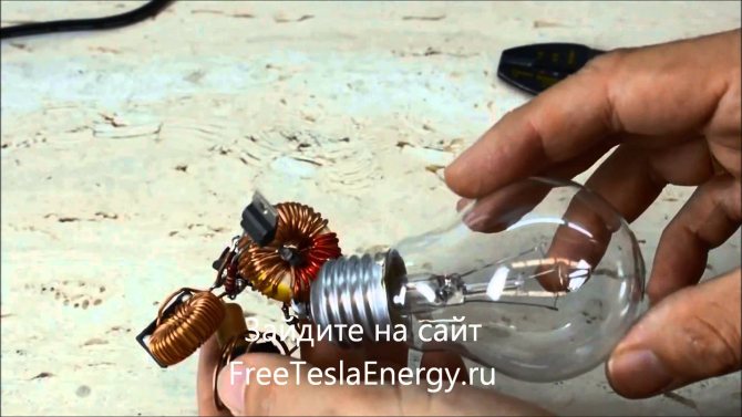 Un consommateur d'énergie est connecté au circuit et plus la bobine de Tesla fonctionne efficacement, plus le courant dans le circuit est élevé, plus les consommateurs de courant peuvent être connectés au système (ou plus puissants).