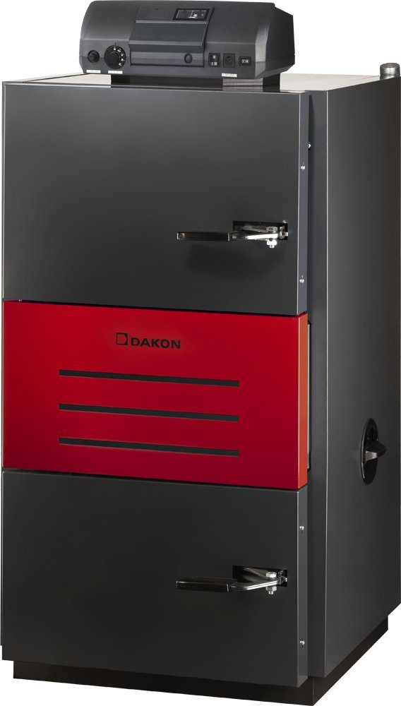 La photo montre une chaudière à pyrolyse Dakon Pyro, capable de fonctionner uniquement dans des systèmes à circulation forcée.