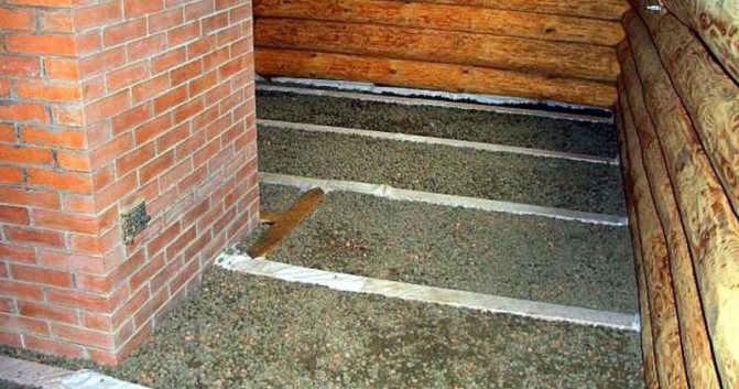 Les bûches sont installées directement sur la chape, qui sont recouvertes d'imperméabilisation. L'espace entre les décalages est posé avec des plaques isolantes.