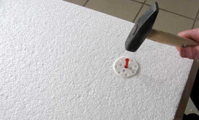 - L'adhérence des plaques isolantes au mur est améliorée grâce à l'utilisation de chevilles fongiques. Ils doivent être martelés dans les trous faits à l'avance avec un marteau. La profondeur à laquelle les fixations sont percées doit être d'au moins 5 cm Il est nécessaire que le capuchon du champignon affleure la surface de l'isolant. Cela signifie que le champignon doit être légèrement noyé dans la mousse. Chaque feuille doit être fixée avec 5 chevilles.