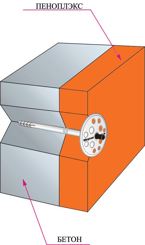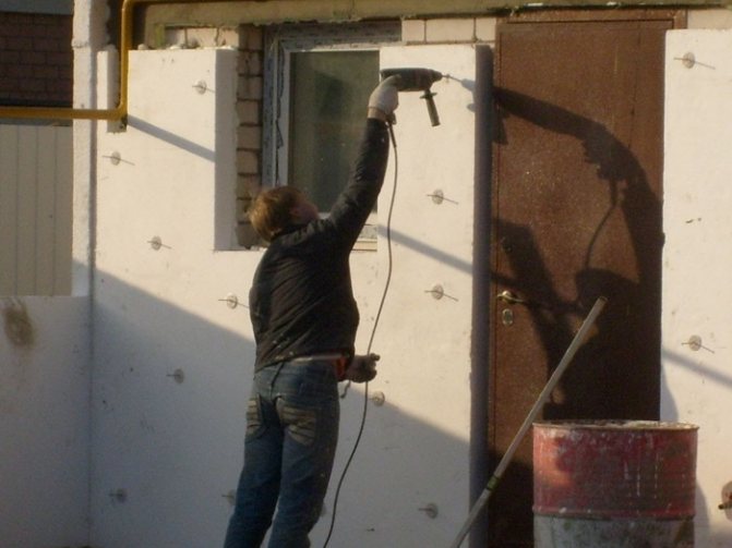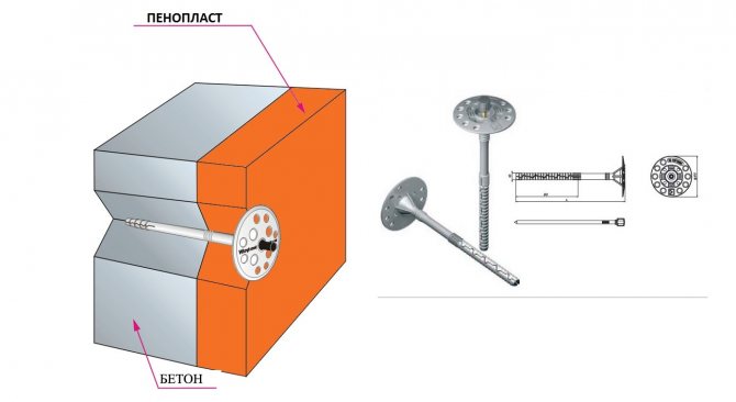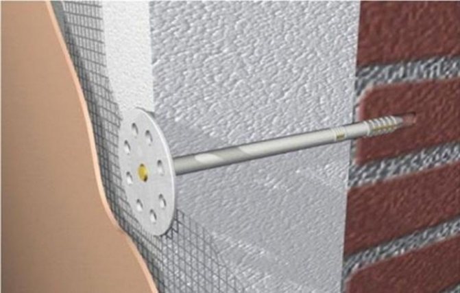 La longueur des attaches est choisie en fonction de l'épaisseur du produit thermique et du matériau des murs.En règle générale, la fixation de la cheville doit être d'au moins 50 mm. Si, base en béton, une valeur minimale de 40 mm est autorisée. Pour les murs en briques, des fixations par chevilles sont recommandées, 70 mm de plus que l'épaisseur de la couche de mousse.