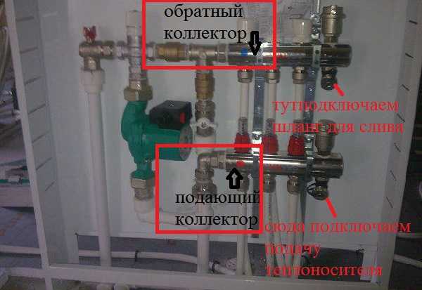 Avant de verser le sol chaud, fermez toutes les vannes de l'assemblage du collecteur, connectez le tuyau à la buse d'entrée. Si vous prévoyez de rincer le système, il est également préférable de connecter un tuyau à l'embout de sortie, dont l'autre extrémité doit être amenée dans l'égout, le conteneur ou dans une fosse de drainage.