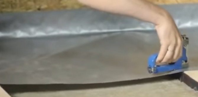 Le pare-vapeur enroulable est fixé sur tout le périmètre de la surface à revêtir avec une agrafe de construction et du ruban adhésif. Dans le cas où les travaux ultérieurs ne prévoient pas d'isolation, pour l'installation du matériau isolant, vous pouvez utiliser des lattes de bois ou de plastique vissées à la surface avec des vis autotaraudeuses.