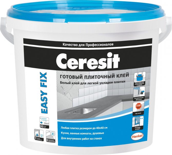 - Mélange adhésif à un composant. Il est très pratique à utiliser, car il est vendu dans un état pâteux prêt à l'emploi, emballé dans des seaux en plastique. La composition de ces adhésifs comprend: l'acrylique, les résines artificielles et les modificateurs. De tels mélanges adhésifs ont un temps de durcissement normal, ce qui permet de corriger les carreaux posés sur eux dans les 20 minutes suivant la pose.