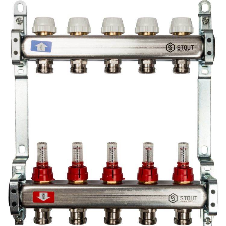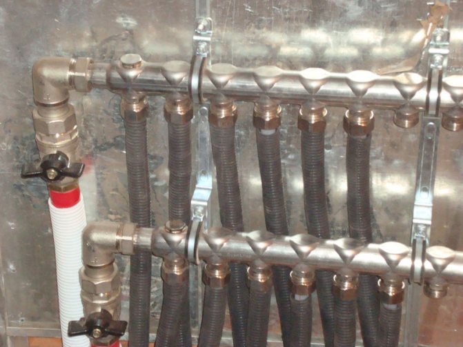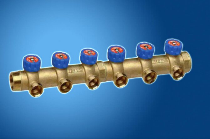 Ce problème assez sérieux est résolu en installant un collecteur de distribution dans le système de chauffage. En fait, il s'agit d'une structure constituée de tuyaux en métal inoxydable, dans le dispositif de laquelle sont installés des dispositifs d'entrée et de sortie du liquide de refroidissement distribué le long des circuits. Pour réguler la température, la pression, le volume du débit et sa vitesse, des vannes d'arrêt sont installées le long des sorties, qui remplissent toutes les fonctions nécessaires.