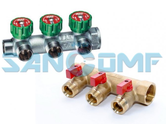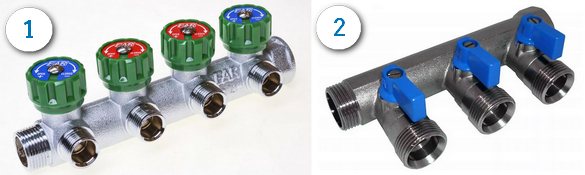 1. Collecteur avec vannes. 2. Collecteur avec robinets à tournant sphérique.